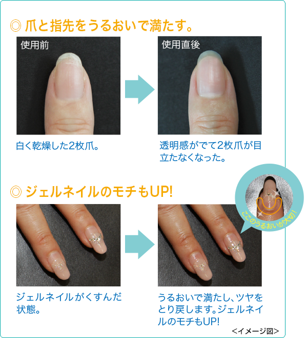 こまめに塗布することで指先の乾燥を防ぎ、ネイルカラーやネイルアートなどの色つやを保ちます。